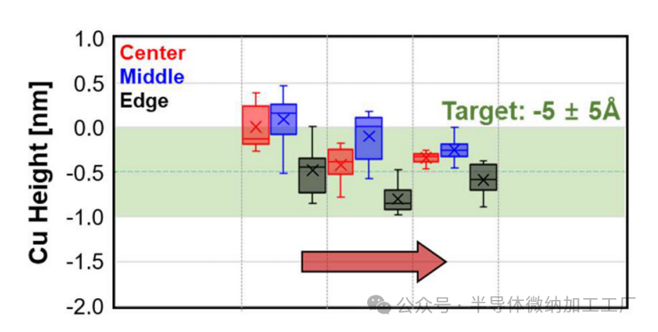 我们设定的目标是在0.4 μm以下的缩小铜垫上实现-5 ± 5 Å的凹陷,以便在整个测试样品晶圆上展示1 nm范围(-10 ~ 0 Å)的结果。根据图4和图5的结果,我们确定了影响中心至边缘变化的主要因素,并据此开始优化工艺条件。考虑到初步试验中约为0.5 nm/周期的蚀刻速率,我们认为2到3次湿法ALE循环足以从+20 Å的突出状态达到1 nm范围。图6展示了多次迭代的代表性结果,表明通过参数研究优化,仍有进一步改进的空间。此外,目前的原型硬件系统在配置成熟度上存在不足,需要通过重新审视喷嘴类型、流量和分配量控制器等组件来寻求更好的性能。