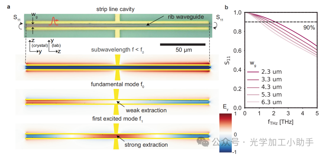 a 通过在传输线两侧终止开放端形成太赫兹腔体。我们通过光学整流作用激发沿肋状波导传播的泵浦脉冲的腔体模式。为了访问这些腔体模式,我们在传输线的中央附近设计了一个宽带天线。