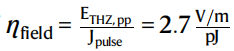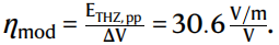 结果表明,所发出的太赫兹电场的峰-峰值 E_THz,pp 与调制后的泵浦脉冲能量呈线性关系,因此也与所施加的电压 ΔV 呈线性关系(图3d)。通过分析斜率,我们得到生成效率: