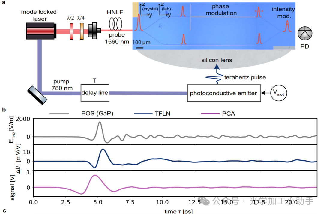 a 用于表征太赫兹探测器的光学设置。探测到的太赫兹辐射来自商业GaAs基光电导天线,泵浦波长为780 nm。1560 nm的探测光脉冲通过耦合到高非线性光纤(HNLF)进行脉冲压缩,脉冲宽度压缩到60 fs。TFLN中的宽带太赫兹探测通过芯片上的电光采样实现。在电光采样中,太赫兹电场调制飞秒探测脉冲的相位。测量这个相位可以重构输入的太赫兹信号。在我们的实现中,探测脉冲的功率被分成两路,沿着马赫-曾德干涉仪的两条臂传播。在其中一条臂上,一个偶极天线捕获传输线中的太赫兹辐射,并通过电光(Pockels)效应对探测脉冲进行相位调制。相位调制的探测脉冲进一步传播到干涉仪的输出分配器,在那里它与沿着第二条臂传播的脉冲发生干涉。这种干涉在干涉仪的输出端产生强度调制,通过光电二极管(PD)进行测量。