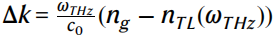 其中,ETHz是入射的太赫兹场幅度,~εTHz(ωTHz)描述了在传输线起始端z = 0处太赫兹脉冲的双边复频谱。通过有限元方法仿真(CST Microwave Studio),我们发现重叠因子ΓEO = 0.6在100 GHz到4 THz的整个带宽范围内对频率的依赖较弱(见附录信息图21)。相互作用的效率取决于相位匹配函数GTL(ωTHz),该函数与太赫兹生成中的函数相同(详细推导见附录4A节)。