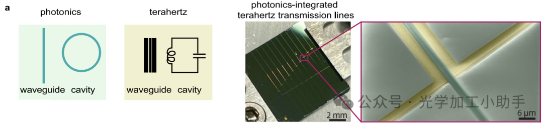 a 光学与太赫兹波导及谐振腔的芯片集成。展示了本研究提出的将光子学与太赫兹传输线相结合的芯片的实物照片和伪彩色扫描电子显微镜(SEM)图像。图中可见包覆层的铌酸锂(LN)波导(SEM 中的深绿色)以及与天线耦合的太赫兹传输线(黄色)。
