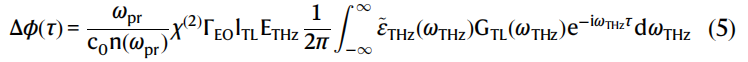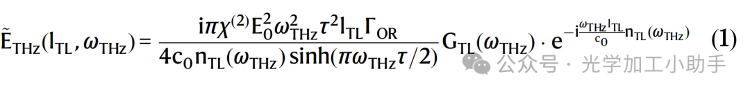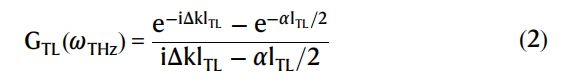 其中,E₀ 是泵浦电场的振幅,τ 是泵浦脉冲的全宽半高(FWHM),c₀ 是真空中的光速,χ^(2) = χ^(2)₃₃₃ = 360 pm/V 是二阶非线性极化率(所有场方向都沿该方向)<sup>72</sup>,ng 是泵浦的群折射率(详见补充材料第2A节)。我们考虑的传输线长度内光学损耗可以忽略不计。我们引入了相位匹配函数,以考虑相位不匹配和太赫兹损耗: