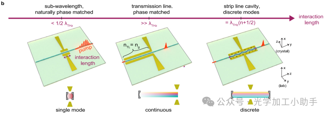 在我们的工作中,太赫兹波在薄膜铌酸锂(TFLN)波导中产生,并沿着波导上的金属带状传输线传播(见图 1b)。具体的几何结构详见补充信息第 1A 节。所产生的太赫兹脉冲主要取决于以下三个因素: