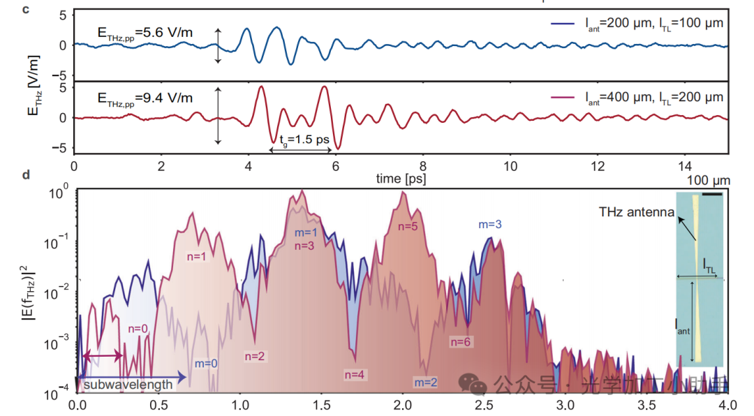 b TFLN 发射器的电场特性,其中传输线长度为 l<sub>TL</sub> = 2 mm,一端连接一个长度为 l<sub>ant</sub> 的偶极天线。该数据是在 1 mm 厚的锌碲晶体中测得的,并与我们之前的演示进行了对比(下方面板,缩放了 100 倍)。
