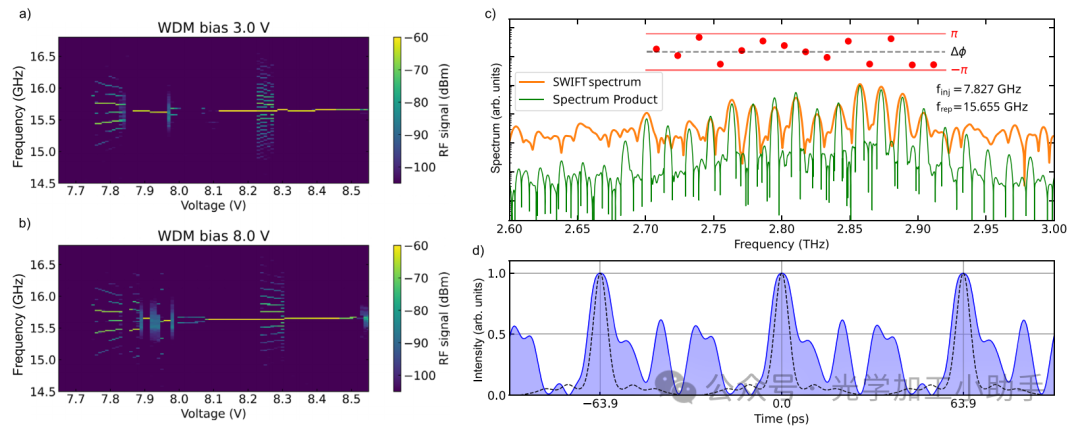 此外,我们还研究了激光发射在激光和 WDM 光谱带宽重叠的频率范围内的相干性。当在自由运行模式下操作 QCL 时,我们在激光动态范围的宽范围内观察到一个强烈的 RF 拍频信号(见图6a、b),这表明激光器运行在频率梳模式下。测量显示,当 WDM 在其放大模式下工作时,在 8 V 以下的狭窄电压区间内出现一些不稳定性。尽管如此,QCL 的整体性能未受 demultiplexer 部分的影响,这表明后者在激光腔中引入了较弱的反馈。为了完全表征发射的相干性特性,我们使用了在补充材料中描述的 SWIFTS14 设置,并配备了一个快速的肖特基探测器(最大频率 < 30 GHz)。我们在 7.87 GHz 的频率下以 +10 dBm 的 RF 注入操作激光器,频率为腔体往返频率的一半。我们观察到在约 250 GHz 的带宽内,频率梳以 frep = 2finj = 15.65 GHz 的频率操作,覆盖了通道 2 和 3。如图6d所示,WDM 分裂后的 QCL 输出的时域重构表现为一个振荡的周期性信号。这种波形是频率梳的混合 AM 和 FM 特性的结果,正如重构的模间相位差所提示的那样。