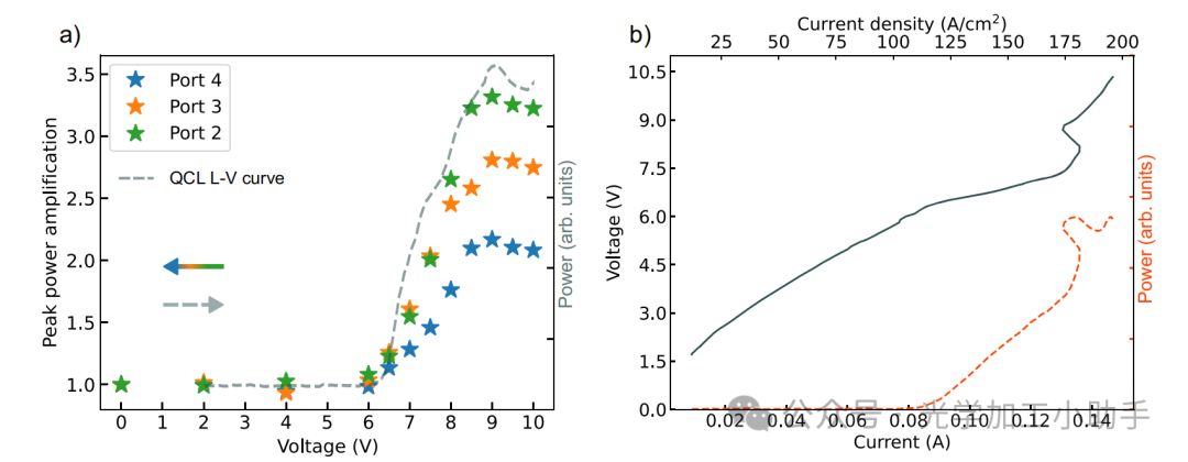 a 每个端口的光谱积分发射信号(星号)作为 WDM 偏置的函数。为了比较 WDM 的阈值和最大放大电压,显示了 QCL 输出功率(虚线)作为 QCL 偏置电压的函数。两者的相似性很明显,因为这两个部分采用相同的活性材料,具有相同的增益。