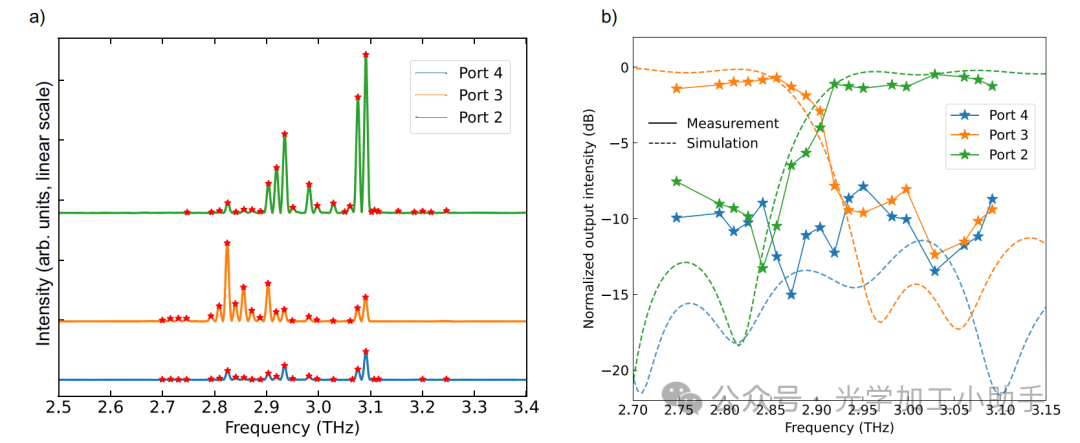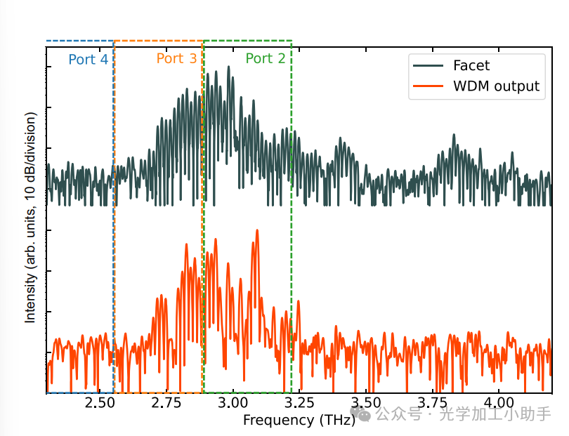 后部裂面的光谱更宽,覆盖了 2.65–4.00 THz 的带宽,具有 15.65 GHz 的自由谱区(FSR),与 QCL 部分的腔长(2.5 毫米)相匹配。三个天线的输出则覆盖了 2.65–3.30 THz 的带宽,这是根据 SPINS 优化和仿真结果预期的。不幸的是,测量的发射光谱相对于故意设计的活性区域带宽略微蓝移,因为它没有延伸到低频(低于 2.6 THz),这些低频信号将会被引导到端口 4。因此,我们预计从端口 4 仅会有一些低强度、未经滤波的宽带发射。