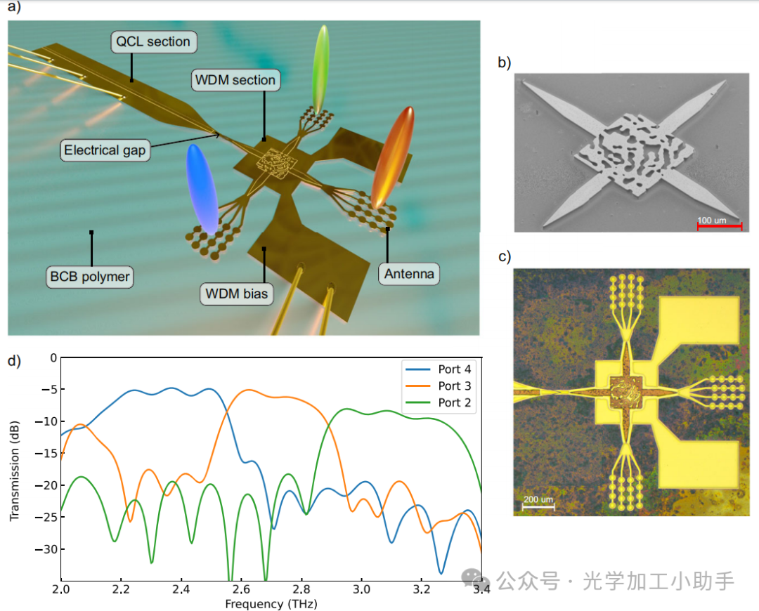 图 1 显示了在 105 次迭代后获得的优化设计以及在每个端口的中心频率下通过结构的模拟功率流。图 1 | 反向设计优化。a 反向设计问题的示意图,从设计空间的定义到最终优化设计。b 使用 SPINS 计算的功率流模拟,在每个端口的中心频率下。这些设备的制造遵循了参考文献25中描述的标准程序:我们采用了宽带活性区域,类似于参考文献40中报道的活性区域。该活性区域具有非常宽的光谱覆盖范围(2.35–4.00 THz)以及低阈值电流密度,使其非常适合作为测试我们宽带三端口 WDM 操作的光源。设备在不同制造阶段的图像见图2,并附有完整结构的示意图。图 2 | 设备示意图和仿真。a 平面化设备结构的示意图,活性材料被 BCB 包围。该设备结合了两个部分:一个 2.5 毫米长的激光腔和一个电气隔离的 WDM 部分,具有表面发射的宽带贴片阵列天线。b 干刻蚀 WDM 反向设计区域的 SEM 图像,尚未进行平面化处理。c 完全制造好的设备的光学显微镜图像。d QCL 部分输出到 WDM 输出端口的 3D CST 数值仿真结果。