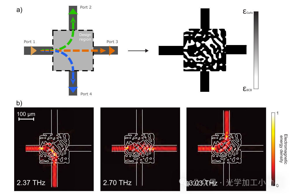 特别地,我们使用SPINS设计了一款太赫兹WDM,具有200 μm × 200 μm的紧凑外形,以及40 μm宽的输入和输出波导,将频率范围在2.2 THz至3.2 THz之间的信号路由到三个宽带输出端口。图1a展示了仿真区域的设置。浅灰色的方形区域代表设计区域,在该区域内,介电常数可以变化;而深灰色的矩形表示输入和输出波导。