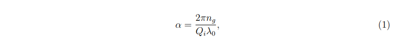图 4(c) 显示了 λ0 = 1617.381 nm 处的准 TE 谐振的放大视图,该谐振模式表现出最高的 Qi = 25.6 × 106,该值是从拟合的本征线宽κ0 = 6.32 × 10−2 pm 中提取的。由此可推断波导传播损耗 α 如下:17