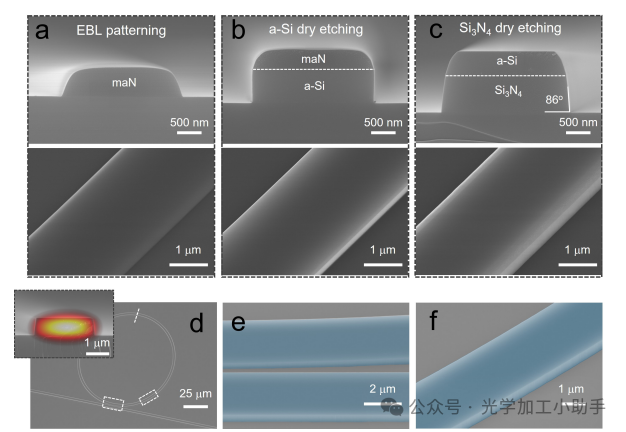 图3:a-Si/Si3N4硬掩模干法刻蚀的特性:(a)-(c) 横截面和倾斜视角SEM图像,显示电子束抗蚀剂、刻蚀后的a-Si硬掩模和刻蚀后的Si3N4层。(d) 制备好的微环谐振器在a-Si硬掩模去除和退火后的SEM图像。插图为谐振器相应的横截面图,并叠加了模拟的准TE波导模式。(e) 和 (f) 假彩色SEM图像,突出显示了总线波导-微环耦合区域和微环波导沿线的光滑波导侧壁,展现了光滑的波导边缘和侧壁。