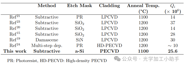 本研究的主要重点是简化使用非晶硅硬掩模干法刻蚀的制造工艺,同时保持高性能。然而,我们也发现了一些其他技术,可以进一步大幅降低光损耗。这些技术中的许多技术是在其他高Q值Si3N4 PIC研究中开发的,下文将进行详细说明: