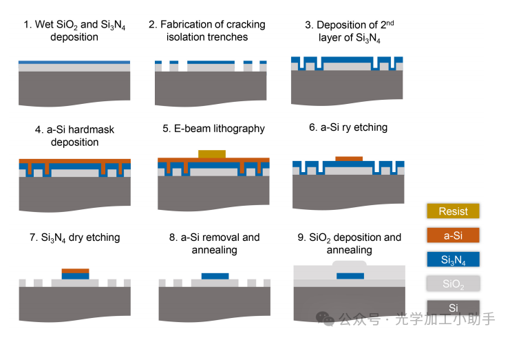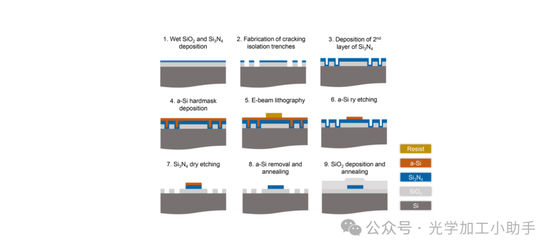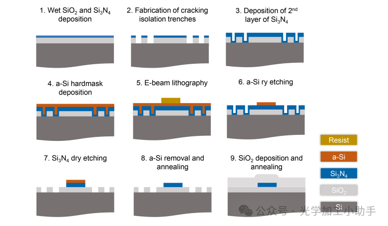 图 1:制造流程示意图:超低损耗 Si3N4 光子集成电路的非晶硅硬掩模蚀刻工艺说明。
