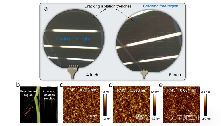 图 2:即用型无裂纹 Si3N4-on-SiO2-Si 晶圆:(a) 制备的 4 英寸和 6 英寸 Si3N4-on-SiO2-Si 晶圆照片,采用 800 nm LPCVD Si3N4 和 700 nm a-Si 硬掩模层。(b) 暗场显微镜图像显示了裂纹隔离槽在阻止裂纹扩展方面的有效性。原子力显微镜 (AFM) 测量的表面粗糙度:(c) 初始 380 nm Si3N4 薄膜,(d) 第二次沉积后的 800 nm Si3N4 薄膜,以及 (e) a-Si 硬掩模层,证实了制备过程中每个阶段薄膜的光滑度和高质量。