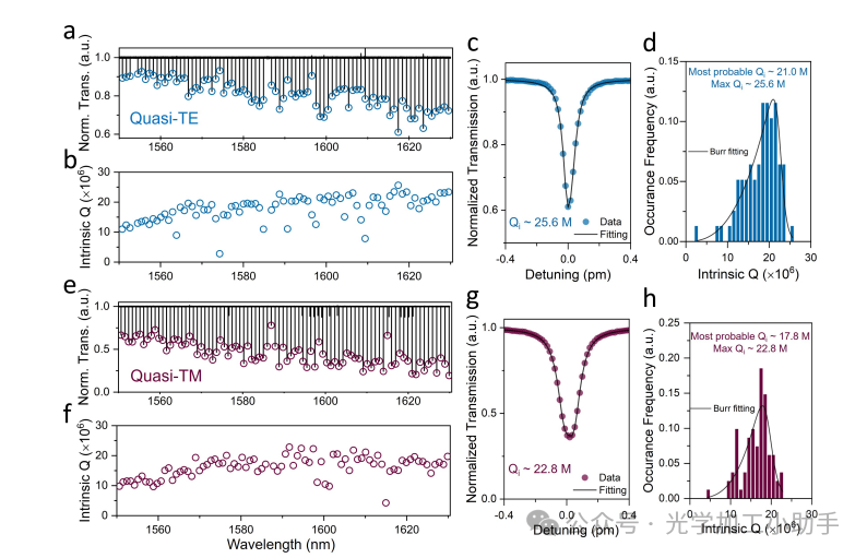 图 4:制备的 Si3N4 微环谐振器的特性。(a) 测量的准 TE 波导模式在 1550 nm 至 1630 nm 范围内的归一化透射 (Norm. Trans.) 光谱。(b) 提取的准 TE 模式的固有品质因数 (Qi)。(c) 谐振腔的放大视图,固有线宽为 κ0 = 6.32×10−2 pm,对应 Qi = 25.6 × 106(百万,M)。(d) 提取的 Qi 因子的直方图,显示最可能值为 Qi = 21.0 M。(e) 准 TM 波导模式的归一化透射光谱和 (f) 提取的 Qi 因子。 (g)固有线宽为 κ0 = 7.17 × 10−2 pm 的共振放大视图,对应 Qi = 22.9 M。(h)准 TM 模式的 Qi 因子直方图,显示最可能值为 Qi = 17.8 M。