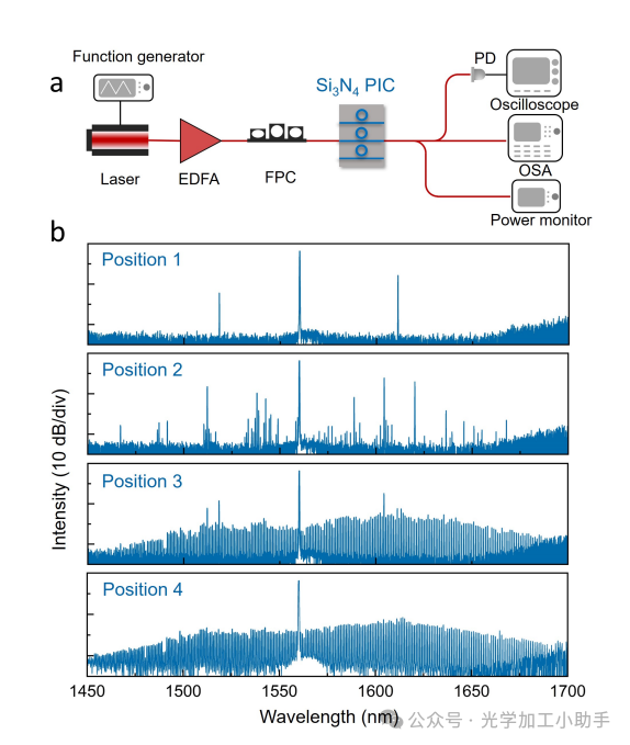 在频率梳生成中,实验装置采用相同的Si3N4微环谐振腔几何结构,其半径R = 200 µm,波导尺寸为2.8 µm × 0.8 µm,如图5(a)所示:可调谐泵浦激光器的输出功率通过掺铒光纤放大器(EDFA)提升至约50 mW。在注入光以激发Si3N4芯片的准TE波导模式之前,使用光纤偏振控制器(FPC)对偏振进行微调。我们使用函数发生器控制可调谐激光器的泵浦波长,使其接近1560 nm附近的目标高Q值谐振频率。图5(b)显示了光谱分析仪(OSA)上显示的生成的频率梳,展示了随着泵浦波长调谐至谐振频率,生成的频率梳的变化情况。图 5(b) 中的位置 1 至 4 显示了在不同激光波长接近微环谐振点时产生的频率梳。在位置 1 处,当泵浦波长开始接近谐振点时,在泵浦波长附近产生了初始的四波混频 (FWM) 边带,标志着频率梳形成的开始。在位置 2 处,随着更多光功率耦合到谐振腔中,由于泵浦波长越来越接近谐振点,级联 FWM 数量增加,并产生了额外的梳状谱线。在位置 3 处,随着泵浦波长更加接近谐振点,进一步的级联 FWM 过程产生了更多的梳齿,并产生了更密集的频率梳谱。在位置 4 处,当泵浦波长非常接近谐振点时,产生了一个宽的混沌调制不稳定性 (MI) 频率梳,每个梳齿间隔一个自由光谱范围 (FSR)。上述结果突出了所制备的 Si3N4 微环谐振器在产生密集宽带频率梳方面的有效性,展示了其在光通信、精密计量、光谱学等领域的应用潜力。