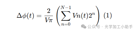 EO-DiAL 概念扩展到具有 N 位分辨率的情况,使用带有传播波电极的分段 MZI 结构在芯片上的示意图如图 1a 所示。一个 N 位的 EO-DiAL 特点是 N 对推拉电极段,而不是传统的单对电极。每对电极的长度是下一对的两倍,因此需要两倍较小的电压(Vπ)来将传播光的相位改变 π(180°)。换句话说,如果最长的电极段的开关电压为 Vπ,那么第二长的电极段的电压为 2Vπ,最短的电极段的电压为 2N−1Vπ。N 位字流(待光学编码)由 N 个二进制电压信号表示。字按时间 t 顺序编码,每个字由一组 Vn(t = mT) 表示,其中 n 是电极段的编号(n = 0 表示最短的电极段,长度为 L,对应最低有效位,n = N−1 表示最长的电极段,长度为 2N−1L,对应最高有效位),1/T 是比特率,m 是顺序字的整数索引。Vn(t) 电压序列每次取两个值之一(Vhigh,Vlow)。当所有电极段由一组 Vn(t) 驱动时,推拉臂中的光场会累积一个相位差 Δϕ,公式如下: