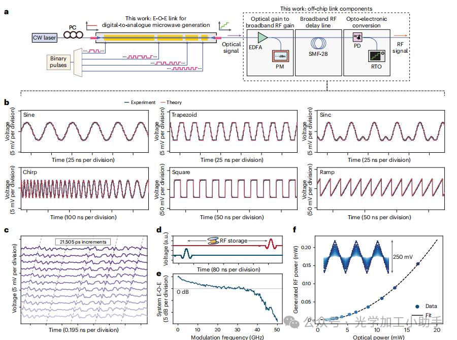 e, 通过放大光载波和调制边带,随后进行电光转换,实现在射频任意波形上的宽带数字到模拟增益。整个系统响应(EO S21)超过了总的数字电子输入功率(−6 dBm,指示在 0 dB 水平),直至 35 GHz 调制频率,这是由于应用了 11.6 dB 的光增益和光电探测器的跨阻增益(750 V W−1)。