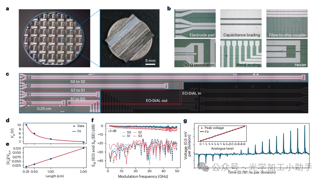 a, 本工作中用于 EO-DiAL 设备的晶圆级工艺(左)与设备(右)。