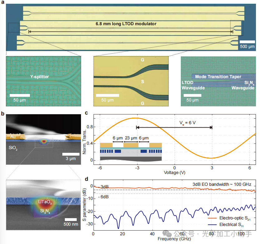 (a) 制作的6.8 mm长混合调制器的光学显微图。插图:调制器基础组件的光学显微图,包括Y型分 splitter、共面波导电极,以及Si3N4波导和Si3N4-LiTaO3波导之间的锥形过渡,模拟插入损耗为0.28 dB。