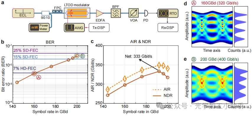 (c) 可实现的信息传输率(AIR,橙色虚线)和相应的净数据速率(NDR,实线棕色)在IMDD测量中的表现,显示在符号速率为192 GBd的PAM4信号下,最高实现的NDR为333 Gbit/s。