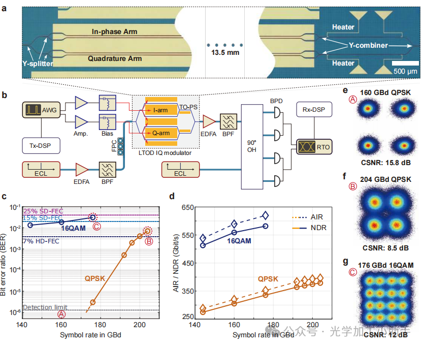 除了MZM和IMDD信号传输,我们的Si3N4-LiTaO3平台还支持更先进的系统,如用于相干通信的IQ调制器(IQM)。图4(a)展示了这样的IQM的显微图。该设备由一个输入波导和一个Y型分裂器组成,Y型分裂器后接两个13.5 mm长的MZM,就像图2(a)所示。每个MZM在其最小传输点使用两个110 GHz偏置Tee(BT110R-C,SHF Communication Technologies AG)进行直流偏置。一个基于加热器的相位移器可以产生漂移自由的热光相位移【44】,然后将IQM中同相(I)和正交(Q)臂之间的相对相位设置为90°。随后,像图2(a)中的功率合并器合成带有两个调制正交的输出信号。为了演示设备的可行性,我们使用图4(b)中所示的设置,在符号速率为144 GBd到204 GBd之间传输正交相位键控(QPSK)和16状态正交幅度调制(16QAM)信号。该设置与图3(a)中用于IMDD传输的设置有几个相似之处。这里,两个AWG通道分别驱动IQM的I和Q臂。调制后,经过放大和带通滤波,调制信号进入90°光学混合模块,在这里与第二个ECL提供的连续波局部振荡器干涉,将光信号下变频为四个电气基带信号。随后的平衡光电二极管(BPD,Fraunhofer HHI)检测结果波形。最后,如补充部分5中所述,离线接收器DSP恢复并评估信号。