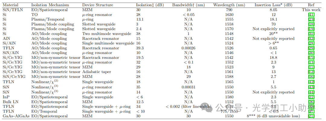 光子集成电路(PICs)将复杂的光学功能集成在单一芯片上,推动了从精密光谱学[1, 4]到量子传感[5]以及高带宽通信[6]等应用的发展。近年来,越来越多的稳定、低噪声和可调谐激光源已经集成到PICs中[7, 8]。这一发展凸显了对集成光学隔离器的需求,以保护这些激光源并确保信号的完整性。即使是少量反射回激光器的光,也能引入噪声,导致激光频率漂移,甚至导致激光关闭。集成光学隔离器作为单向障碍物,在反射光到达激光腔之前将其阻挡。通过消除反馈,它们保证芯片上的光子电路提供稳定、可靠的光信号。与利用p-n结的简单非线性特性工作的电子二极管不同,光学隔离器必须依赖更复杂的光学机制来打破大多数光学介质固有的洛伦兹对称性[9]。
