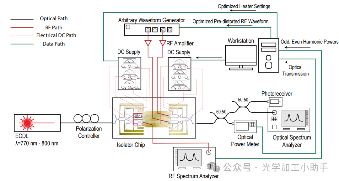 图 S2. DRDI隔离器表征的实验设置。外腔二极管激光器进行偏振控制,并通过锥形透镜光纤耦合到隔离器芯片中,光纤的标称模式场直径为2 µm。多接触射频探针将两条射频线(实线红色)传送到CPW,并将六条直流线(虚线红色)传送到芯片上的微加热器。一个双通道任意波形发生器(AWG)提供预失真射频波形。所有仪器通过数据/控制线(绿色)连接到中央工作站,工作站迭代调整AWG波形和加热器设置。