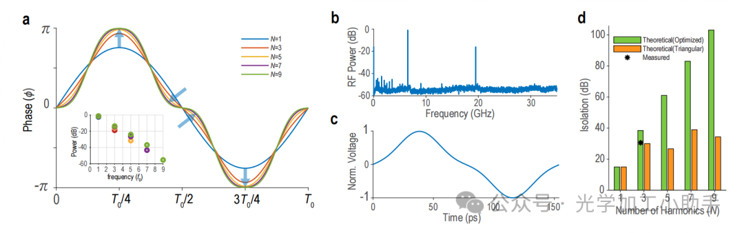 d. 截断谐波三角波形(橙色)和数值优化波形(绿色)对比的理论隔离度与谐波数目(N)的关系。实验测得的隔离度显示为黑色星号。