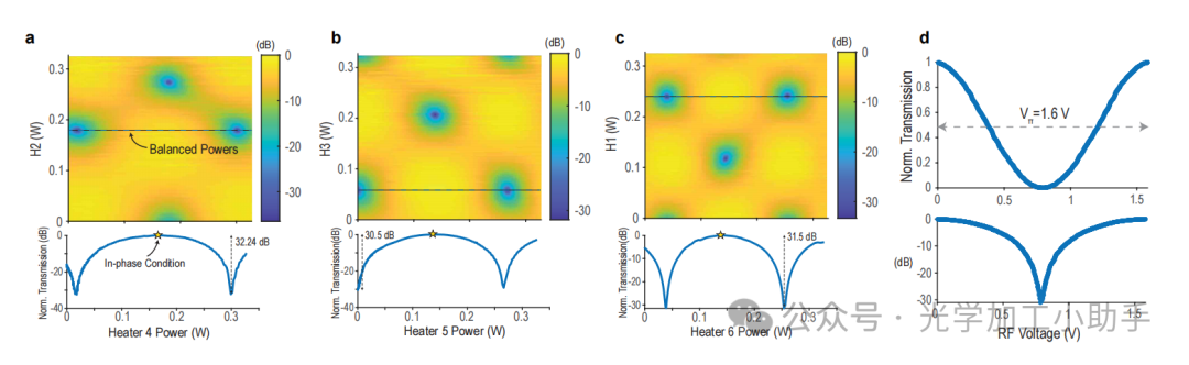 (上) 在没有射频的情况下,按加热器电功率的函数,分别为上通道对(H2,H4)、下通道对(H3,H5)和通道间(H1,H6)的归一化光学传输的二维图,使用对数尺度。H1、H2和H3控制通道之间的功率平衡,而H4、H5和H6控制通道之间的相位关系。虚线表示加热器设置,用于平衡光学通道之间的光功率。