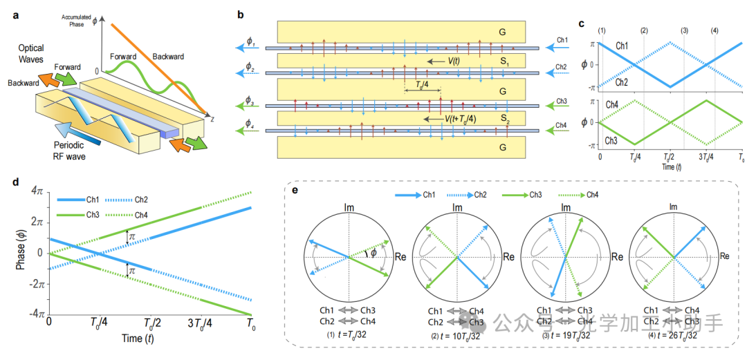 a. 单个行波相位调制器元件的概念图。一个周期性的射频波(蓝色三角形)与反向传播的光(橙色箭头)同向传播,但相对于正向传播的光(绿色箭头)是反向传播的。侧边的图表展示了每个方向的传播距离与累计相位(ϕ)的关系,说明正向传播的光没有净相位偏移,而反向传播的光则表现出线性相位积累。