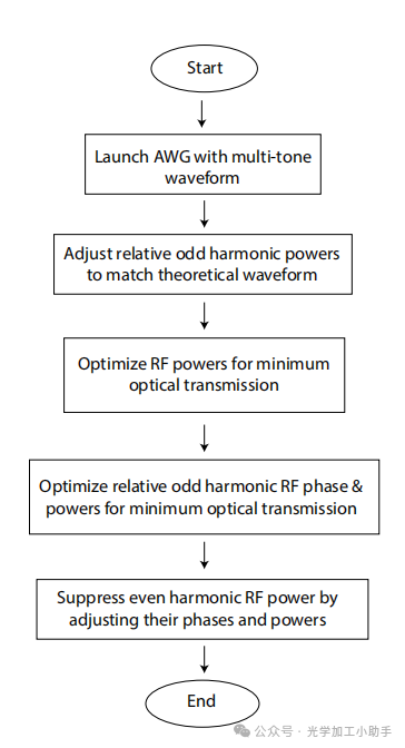 图 S5. 射频波形优化流程图。为克服射频路径中的非线性和衰减,我们生成了一个由基波和奇次谐波组成的多音射频波形,并基于测得的CPW输出频谱和光学传输最小值,迭代调整其幅度和相位。通过微调偶次谐波的相位和功率,抑制任何残余的偶次谐波。