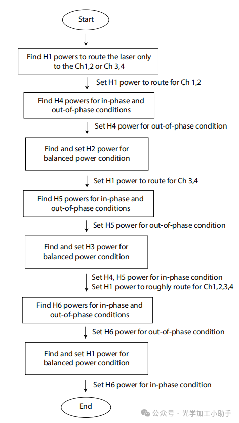 图 S3. 微加热器优化流程图。首先,H1将光路引导到上推-拉对或下推-拉对。每对首先设置为反相条件,然后调整以平衡功率,再切换到同相条件。H6调节到反相条件以平衡两对之间的功率,然后切换到同相条件。