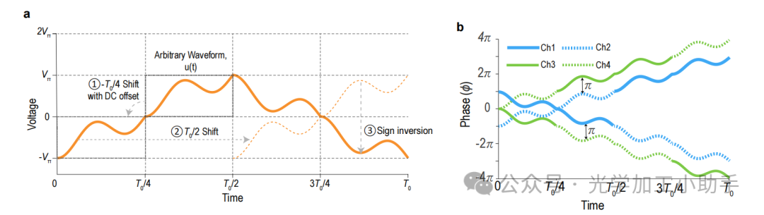 b. 四个通道在一个射频周期(T0)内的时间分段展开累积相位。在每个四分之一周期内,通道形成两个取消对,每对保持π相位差,实现DRDI方案。