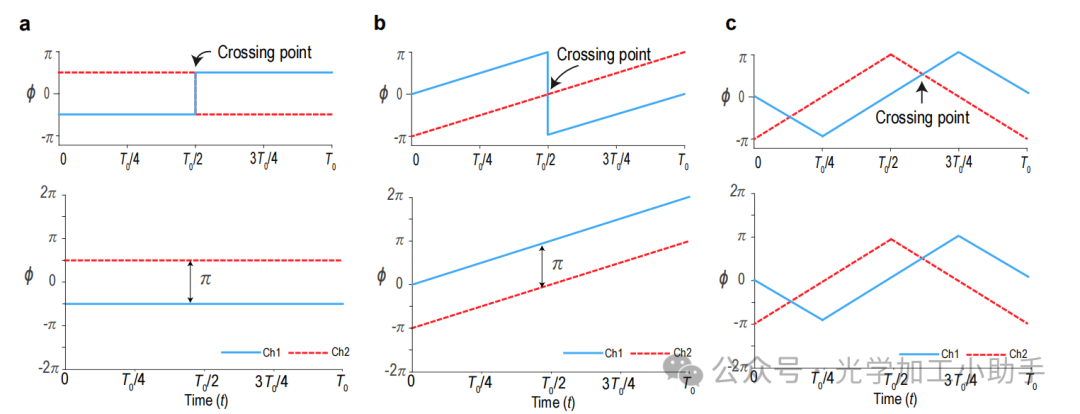 阻断相干波的基本原理是破坏性干涉,当两个或多个波的相量和为零时就会发生。在实践中,这可以通过将具有恒定相位差的等振幅波结合起来实现。然而,在周期性的零均值相位调制下,保持相干波之间恒定的相位差变得具有挑战性,因为这种调制方式要求正向传播的光不受影响。一个简单的可能性是通过两个方波或锯齿波驱动相位调制,并且使它们相差半周期,以便使用仅仅两个光波模拟恒定相位条件[26]。然而,这些波形固有的急剧波形不连续性使得这种方法不可行,并显著限制了可实现的隔离性能(扩展数据图2)。相比之下,三角波形在时域内没有波形不连续性,因为它们具有正负斜率,尽管它们的导数存在不连续性。由于三角波形包含正负斜率,在这两种相位调制波之间无法实现破坏性干涉。总是会有一个交叉点,在该点,它们的调制相位重合。因此,我们开发了一种动态旋转破坏性干涉(DRDI)方案,以避免这个问题,并使用四个三角波形(或更一般地,四个具有正负斜率的时延波形)实现相位调制波的完全取消。稍后我们将在本文中介绍一种波形设计过程,用于去除三角波形固有的导数不连续性,同时优化以获得更高的隔离度。这里,我们使用三角波来描述其基本原理。