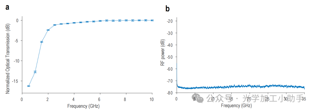 a. 正弦射频驱动频率的归一化光学传输。 在0.5 GHz时,传输强烈衰减,低于-15 dB。 随着频率增加,零均值相位调制导致净相位偏移减小,光学传输增加。 所有值均归一化为10 GHz时的传输值。