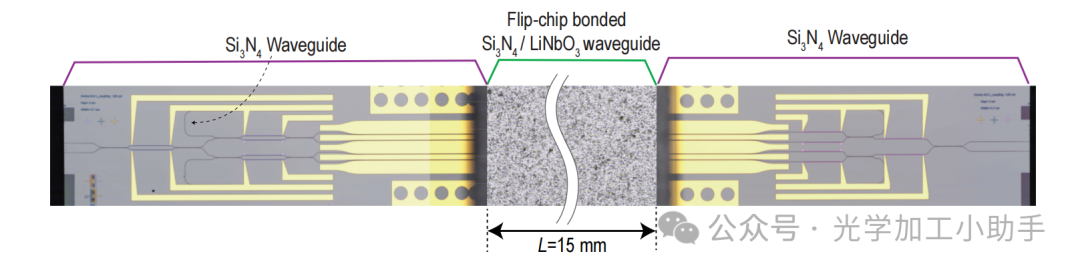 黑色的窄水平线表示氮化硅光学波导。相邻的铬微加热器调节芯片中央区域四个并行通道之间的功率平衡和相位差,其中倒装键合的铌酸锂与氮化硅波导耦合,形成电光活性混合波导。承载射频驱动波的共面射频波导对每个通道的光相位进行调制,调制长度约为15 mm。