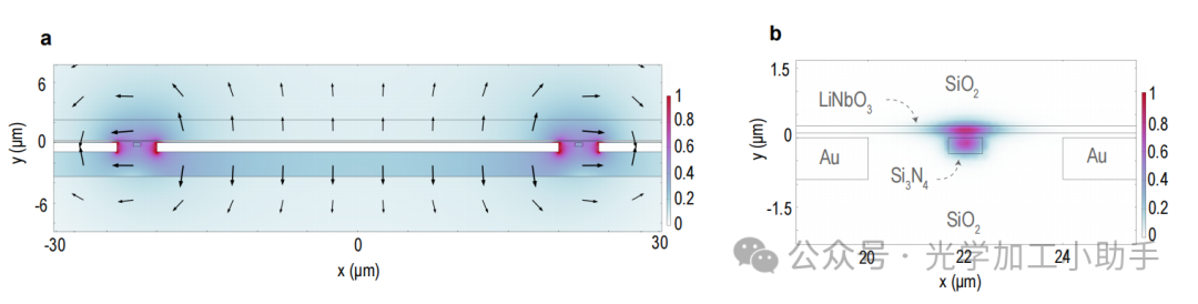 为了最小化SiN波导与SiN/TFLN混合波导之间的模式不匹配损耗,该损耗来自TFLN的较高折射率,SiN波导的宽度在键合接口的边缘处扩展到约2 µm,完全限制光模式在SiN内并抑制其与TFLN的渐逝重叠。在键合接口的另一端,SiN的宽度逐渐减少到700 nm,光模式转移到TFLN中以实现高效的电光调制。在键合接口的另一端,SiN宽度再次恢复到约2 µm,采用相同策略。2×2方向耦合器的冗余输出端口被引导到埋藏金电极旁,吸收残余光并防止回反射。