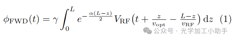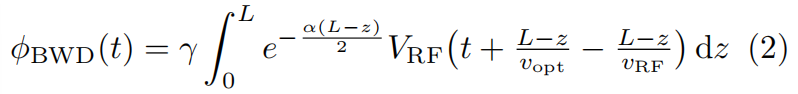 其中,z 表示调制器沿线的位置,L 表示调制长度,ϕFWD 表示正向传播光的累计相位,正向传播光相对于射频波是反向传播的。在这种情况下,光波从 z = 0 传播到 z = L,而射频波则从 z = L 传播到 z = 0。ϕBWD 表示反向传播光的累计相位,反向传播光与射频波同向传播,从 z = L 传播到 z = 0。VRF(t) 是射频电压波形在时刻 t 的瞬时值,α 是射频波的功率衰减常数,vRF 是射频波的相速度,vopt 是光波的群速度,γ 是电光相位调制系数。当正向传播的光与一个具有零均值周期波形的反向传播射频波相互作用时,光波所经历的瞬时相位调制本身也是一个零均值周期函数。在射频功率衰减可以忽略不计的极限情况下(α ≈ 0),选择