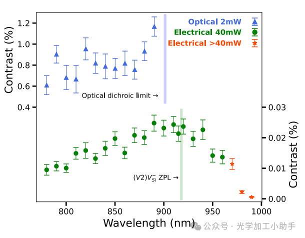 图4:1 µm薄膜4H-SiC在SiO2上的Rabi对比度的波长依赖性。每个数据点表示一个Rabi周期,拟合为衰减的正弦函数。Rabi通过光学方式测量,激光功率为2 ± 0.5 mW,直到900LP二向色滤光片的限制;通过电学方式测量,激光功率为40 mW ± 5 mW至960 nm,40至70 mW至990 nm,直到测得的光电流达到暗电流。光学误差直接来自拟合,电学误差为实验稳定性带来的5%变化与拟合误差的组合。