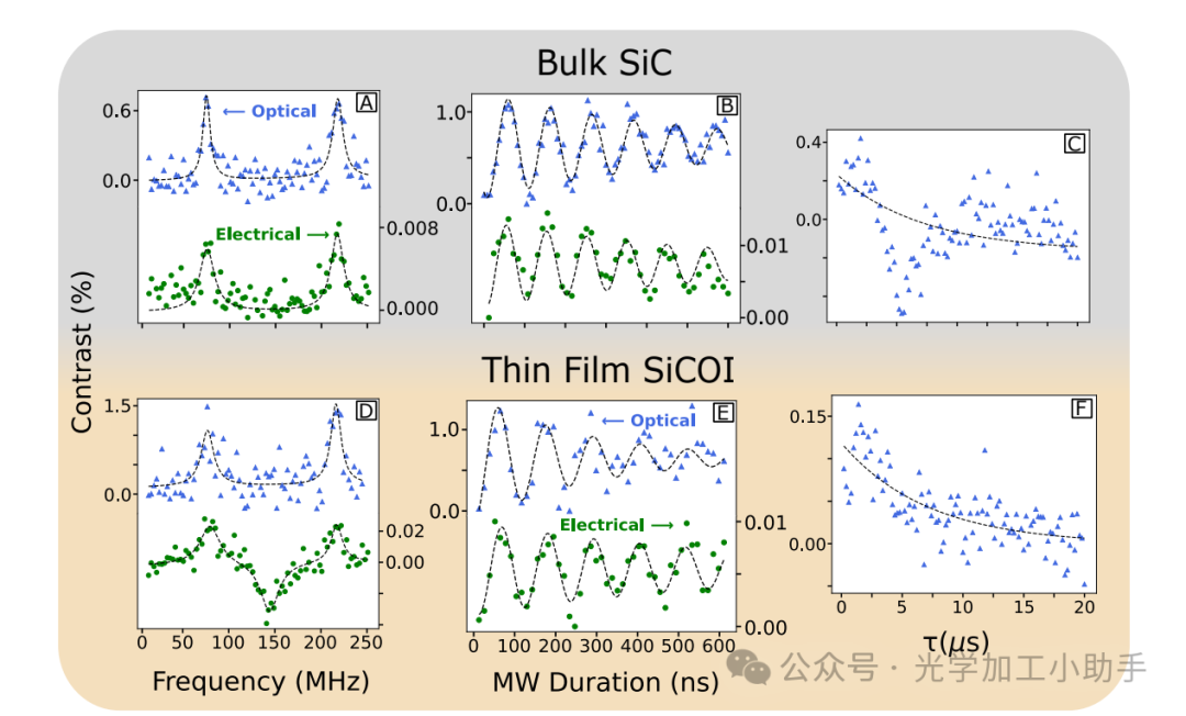 图3:在1.3 µm薄膜SiCOI器件(D)和体积500 µm样品(A)中测得的脉冲PDMR和脉冲ODMR。所有电学测量在8 V偏置、890 nm和45 mW下进行。电学Rabi振荡在体积样品(B)和薄膜样品(E)中观察到,对比度约为0.01%。光学T2 Hahn回声测量(C,F)显示薄膜和体积样品的相干时间约为7 µs。