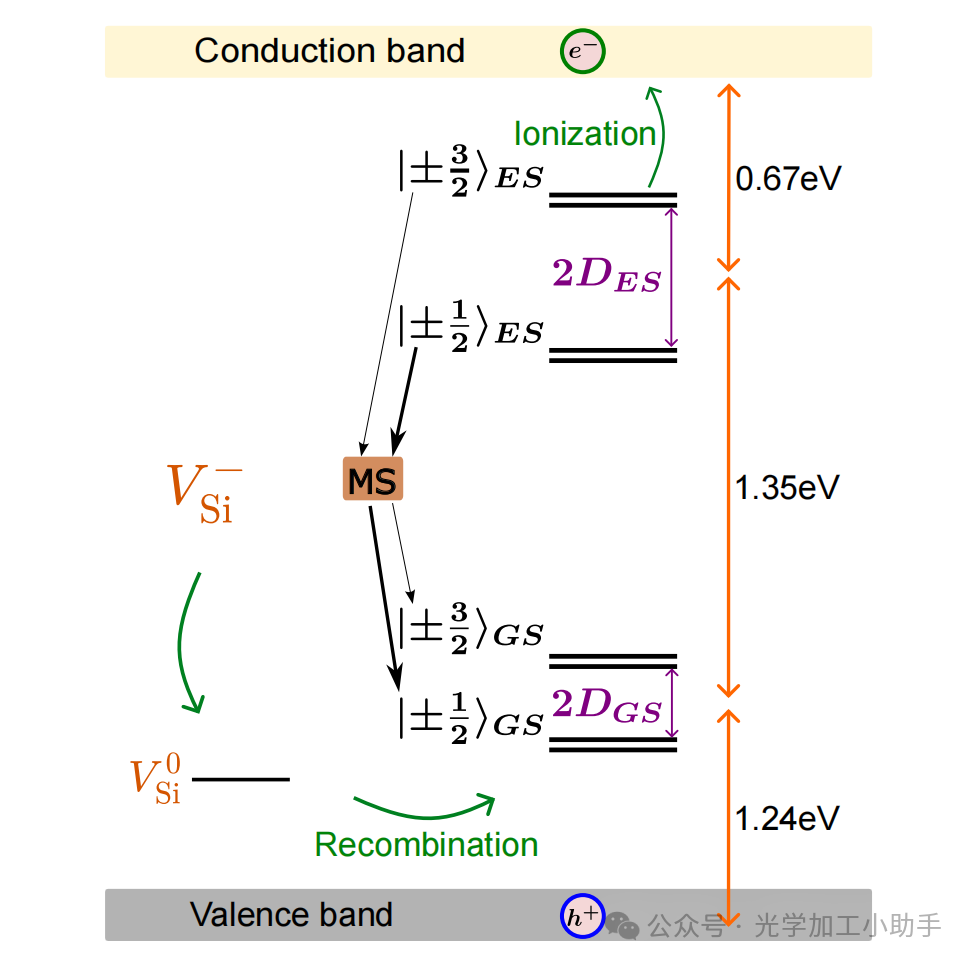 图1:VSi−自旋四重态能级,VSi−的基态和激发态之间的光学跃迁能量为1.35 eV。绿色箭头表示电荷循环。通过双光子吸收和光子引起的价带孔生成,缺陷引发的光电流由导带中的电子生成。