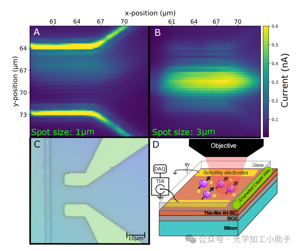 图2:在23 mW、10 V偏置和870 nm激发下,4H-SiCOI器件的共焦光电流扫描(A,B)。在聚焦(最大1.2 nA)和散焦(最大0.8 nA)激发条件下进行测量。图(B)中的较大光斑尺寸展示了光电流强度的更广泛分布。图(C)为电极器件的显微照片,表面覆盖了自旋涂层玻璃,测量配置如图(D)所示。