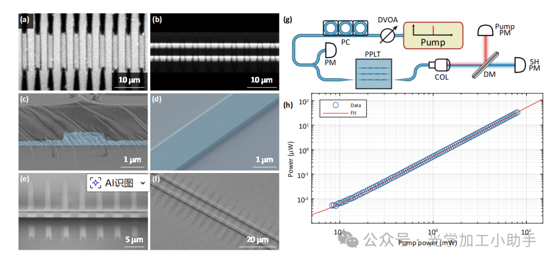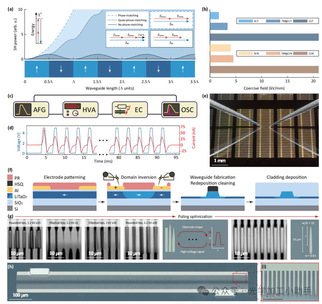 (e) 一张SEM图像,展示了一种允许快速高分辨率观察周期性畴反转的波导。