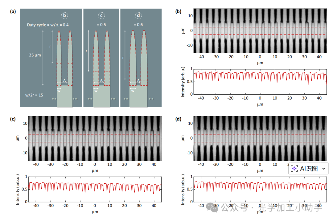 (b-d) 使用占空比分别为40%、50%和60%的电极进行的畴反转。对于所有电极,都使用了优化的30脉冲脉冲序列。