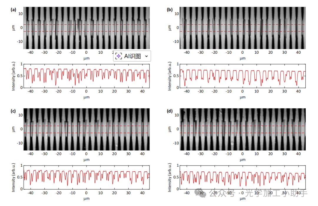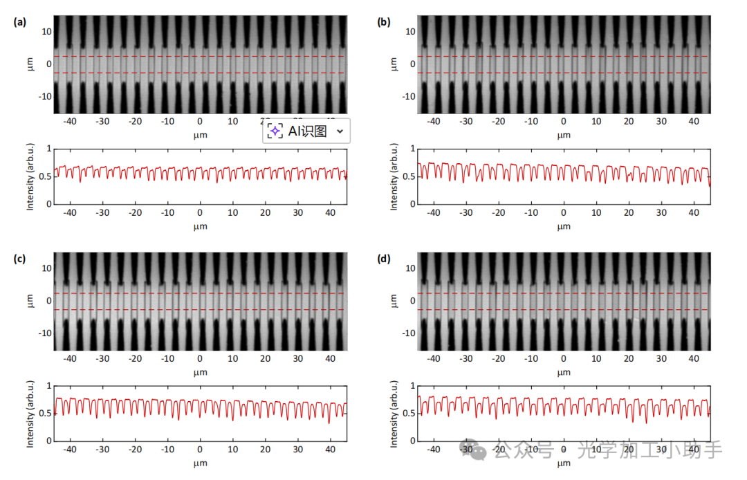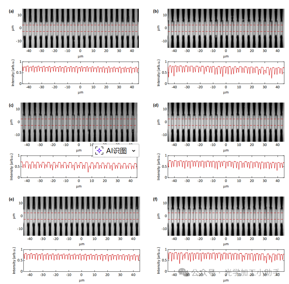 如主文中所述,我们使用双光子显微镜来验证LiTaO3样品中的畴反转。在本节和下一节中,我们展示了使用该显微镜拍摄的图像(例如,图S1中的(b-d)面板),以提供更多有关极化动态的信息。在每张图像下方,有一个面板显示了在两条红色虚线之间区域的平均强度。显微镜中的激光器工作在大约1 µm的波长,探测器捕捉到相应二次谐波的发射。电极在这些图像的上下部分呈现为完全黑色的周期性结构,因为它们不会产生任何可以用显微镜捕捉到的光学信号。亮区表示在薄膜LiTaO3中生成的信号的存在,细黑线表示反转畴之间的边界。它们的黑色外观是由相邻畴中产生的光子相干干涉所解释的。