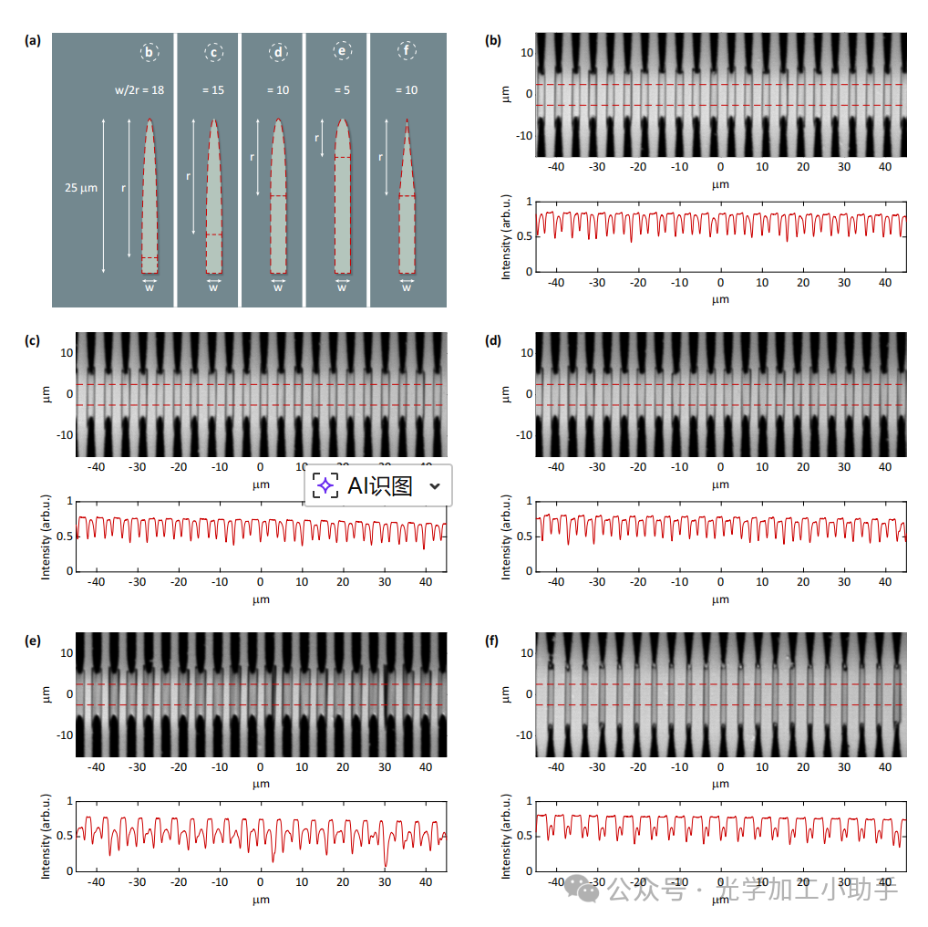 我们发现电极形状对最终的极化质量有显著影响。我们测试了许多具有椭圆形和三角形尖端的电极,如图S3(a)所示。椭圆形尖端的轴比为18和15(图S3(b,c))时,得到了最佳的结果。轴比为10的电极(图S3(d))依然表现良好,反转畴更宽,接近所需的占空比。然而,畴的均匀性略差,这使我们更倾向于使用轴比为15的电极。进一步减少轴比则一致地导致畴反转变宽且均匀性下降(图S3(e))。
