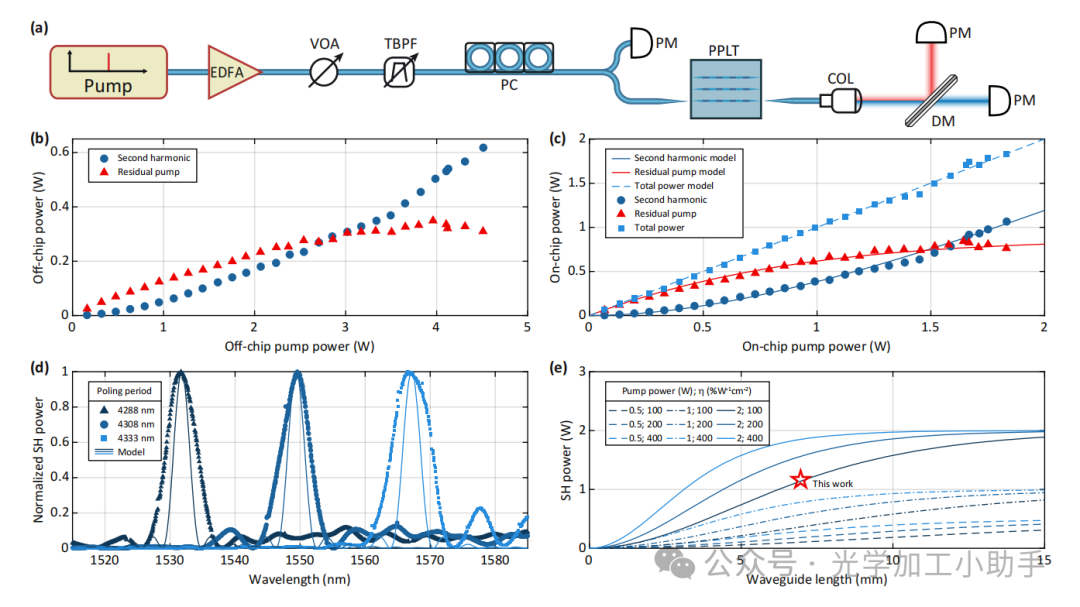 (e) 在不同长度的波导中,根据不同泵浦功率对潜在SHG性能进行的数值模拟,展示了效率的提升。红色星号表示本工作中的结果。