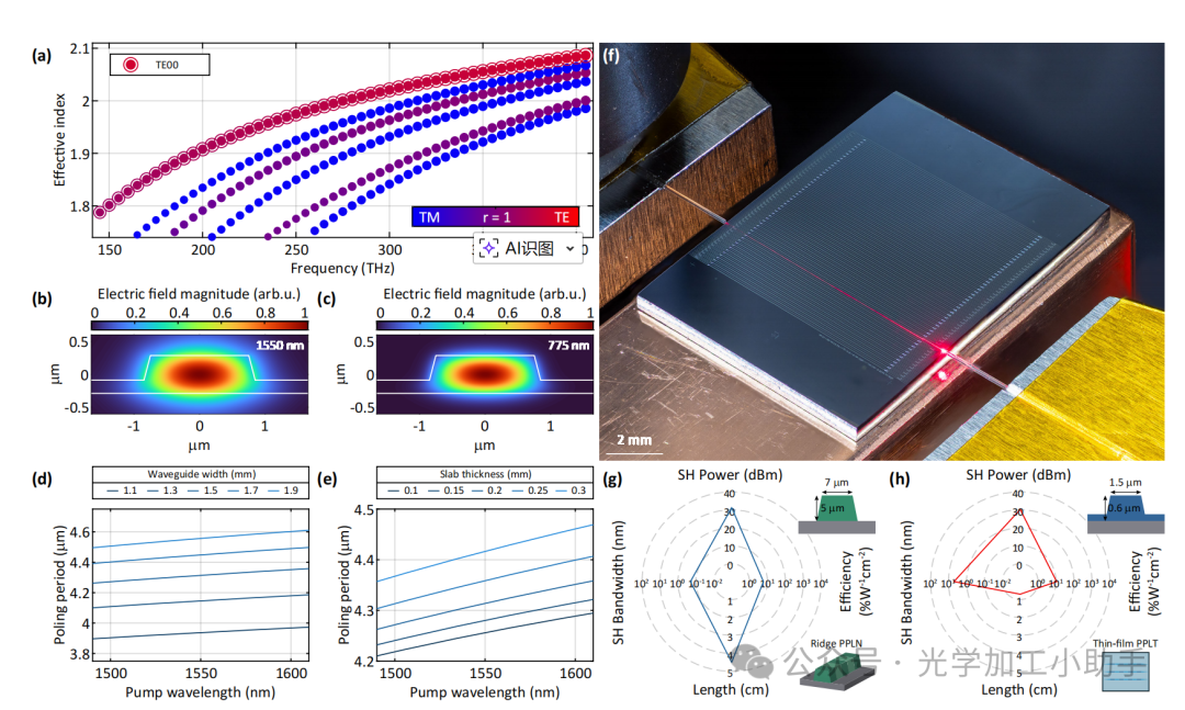 (g, h) 对比了基于文献[16]数据的脊状PPLN波导和本工作中的薄膜PPLT波导的性能。